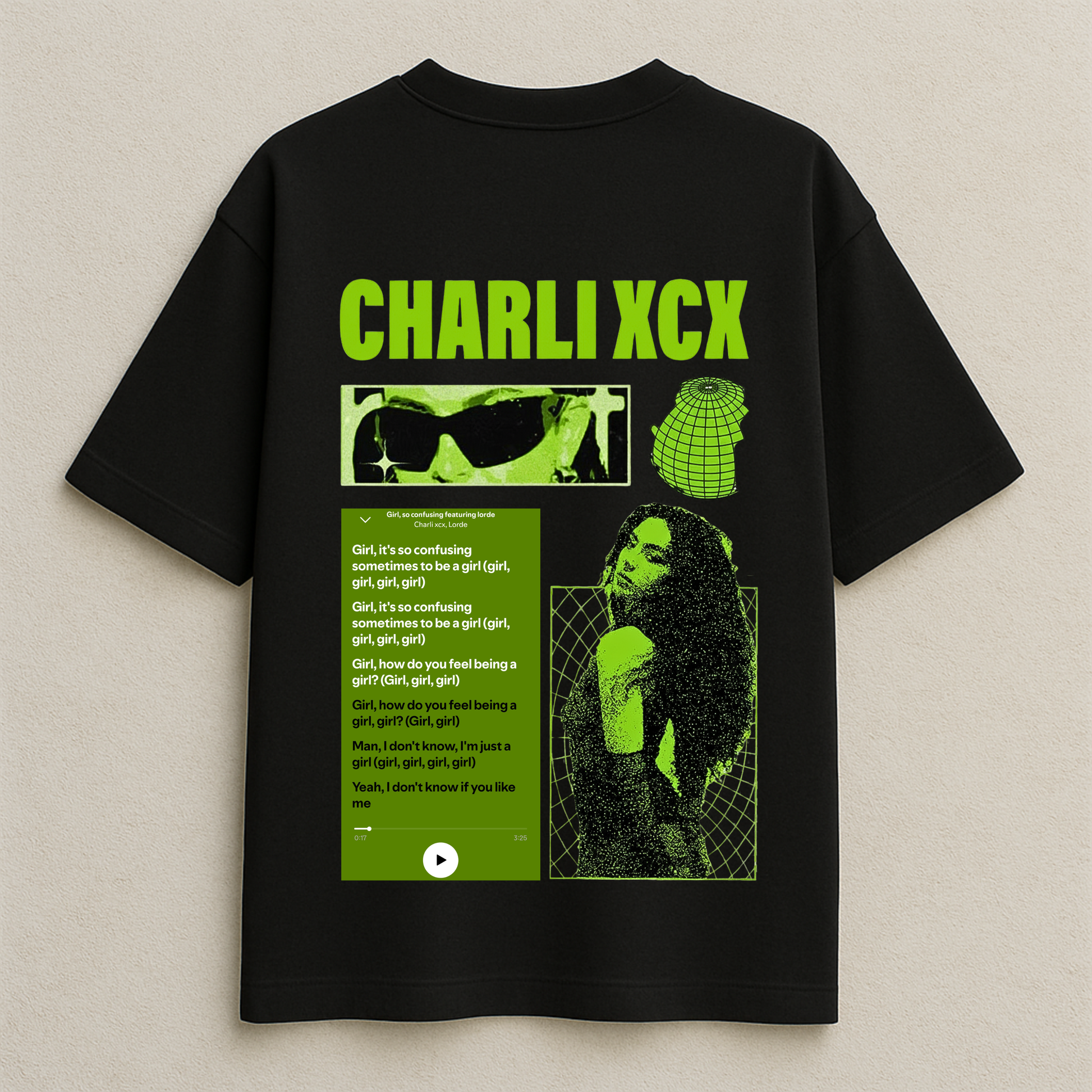 • Bold “BRAT” graphic with neon pop-inspired aesthetics